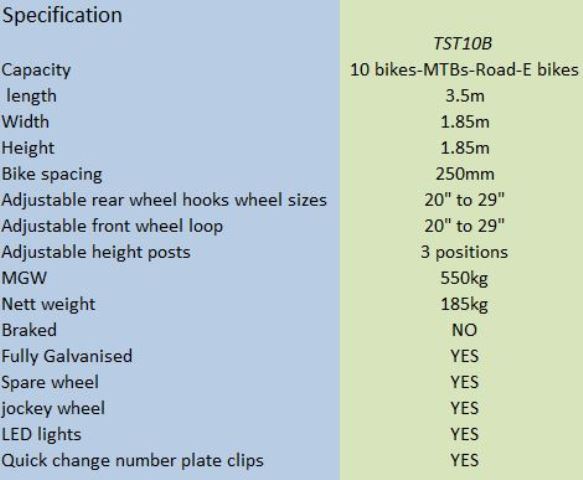 TST 10 Bike Trailer is ideal for small groups. *Can be configured to carry MTBs, Road bikes, Gravel bikes, and E-bikes. *Adjustable front & rear wheel slots for 24" to 29”wheels.The front wheel rack have 3 height settings. *All our bike trailers are fully galvanised, DVSA approved, fitted with spare wheel and jockey wheel, LED lights and reflectors, straps to secure bikes. Helmet box optional
