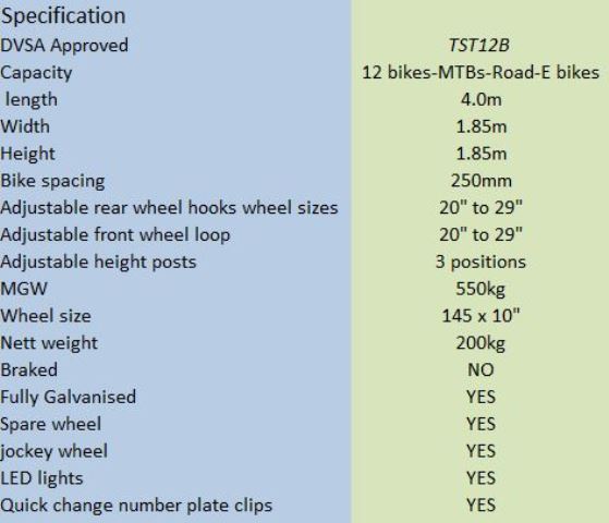 TST 12 Bike Trailer is ideal for small/medium groups. *Can be configured to carry MTBs, Road bikes, Gravel bikes, and E-bikes. *Adjustable front & rear wheel slots for 24" to 29”wheels.The front wheel rack has 3 height settings. *All our bike trailers are fully galvanised, DVSA approved, fitted with spare wheel and jockey wheel, LED lights and reflectors, straps to secure bikes. Helmet box optional